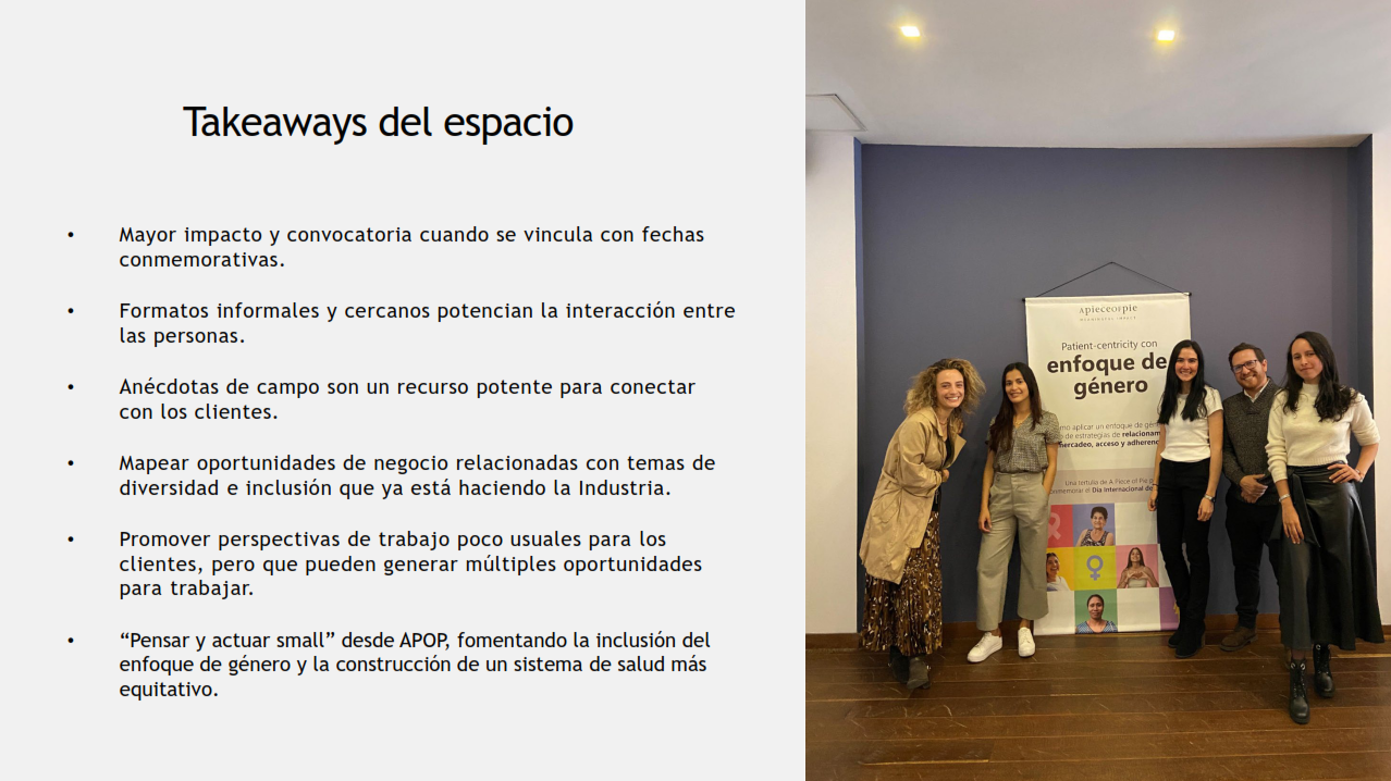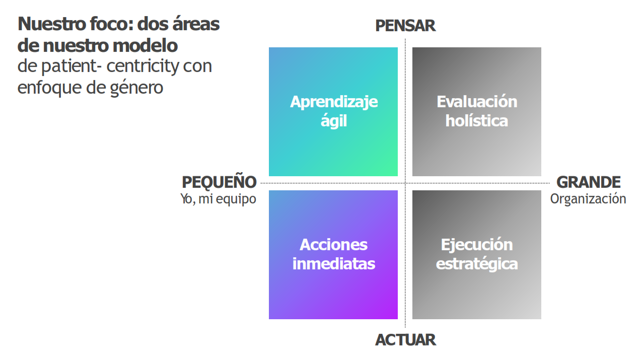 Para esto, se muestra la implementación del modelo de Patient-Centricity de APOP con enfoque de género, en donde se profundiza en dos de las cuatro áreas de la matriz: “Aprendizaje ágil” y “Acciones inmediatas”. Adicionalmente, se brindan diferentes herramientas para cada área.